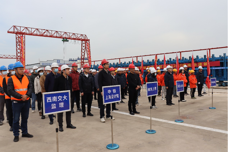 11月16日上午,“交通先導爭先鋒”黨建主題實踐活動暨洋呂鐵路首片T梁澆筑儀式在中鐵四局集團有限公司啟東制梁場舉行,“黨員先鋒隊”和“青年突擊隊”現場接受授旗。10點28分,隨著南通沿海集團副董事長黃浩宣布,洋呂鐵路首片T梁預制正式開始澆筑,標志著洋呂鐵路建設進入一個新階段。